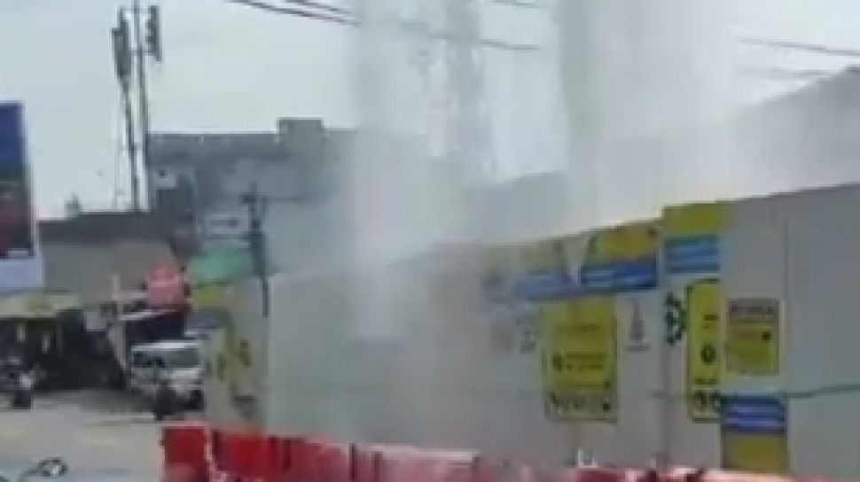 SuaraBekaci.id - Air menyembur tinggi dari proyek pipa milik perusahaan air minum di wiliayah Jalan Jatiwaringin, Pondok Gede, Kota Bekasi, Selasa (17/6/2025).